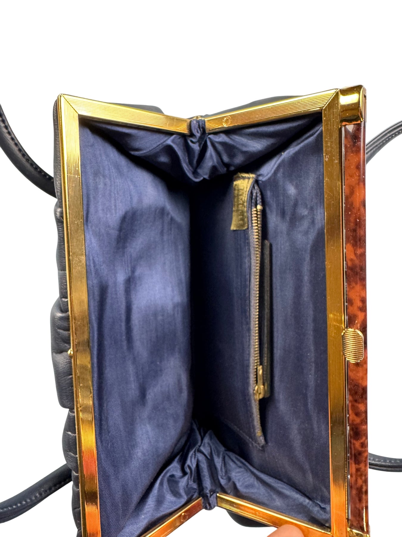 Elegant navy leather handbag featuring a tortoiseshell-like frame accent and gold-tone clasp. Dual leather handles for comfortable carrying. Interior features a single zip pocket.