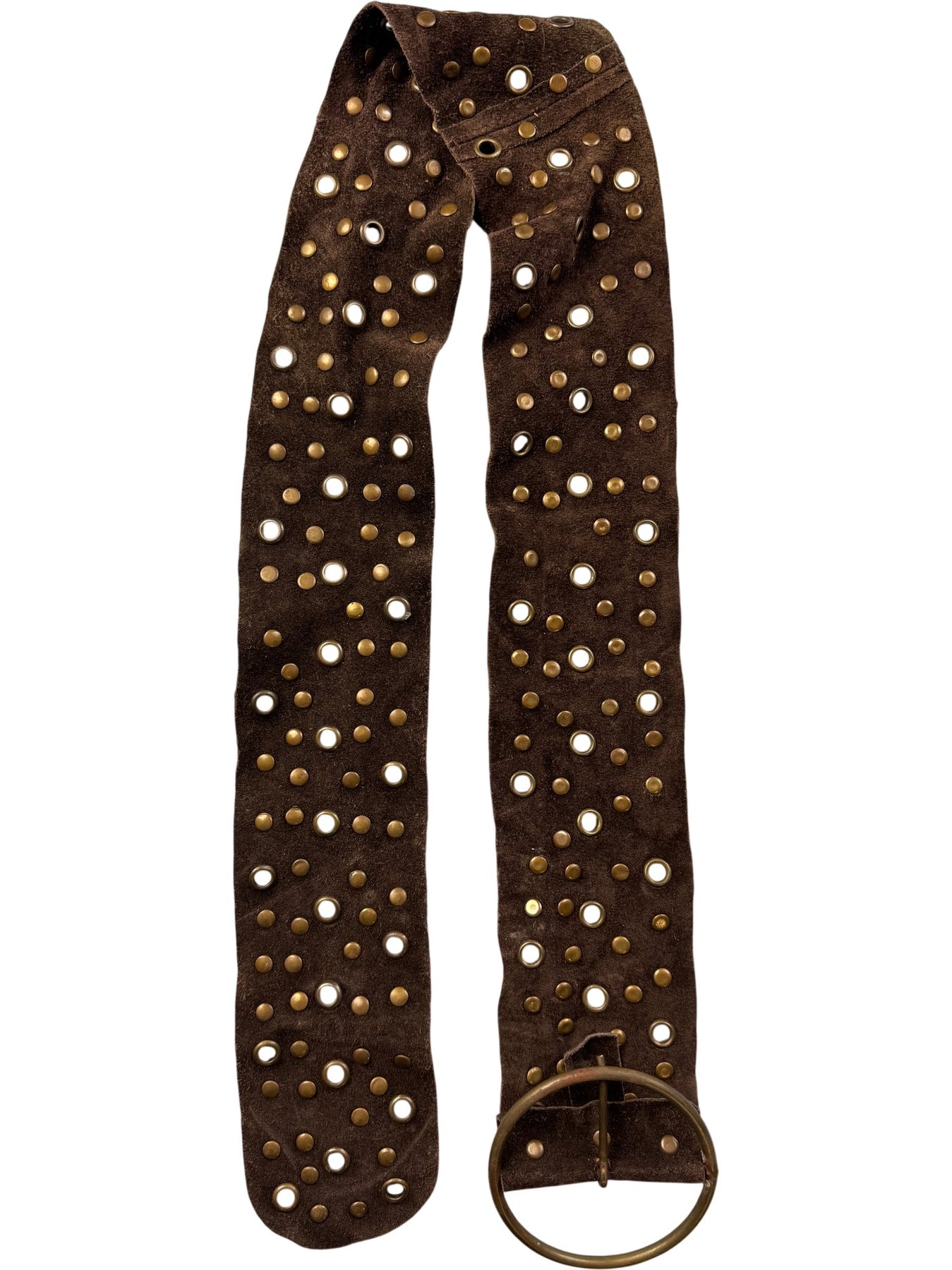 Brown leather belt featuring a studded pattern with metal eyelets. Equipped with a round metal buckle for secure fastening.