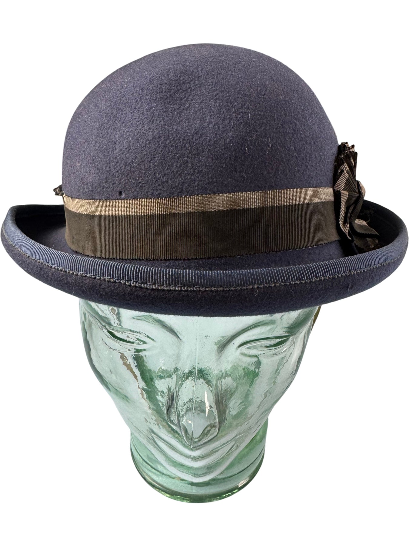 Classic Blue Wool Bowler Hat with Ribbon Detail