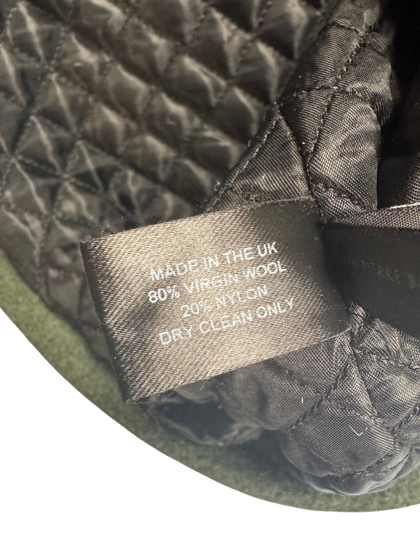 Olive green overcoat made from 80% virgin wool and 20% nylon. Features a button-down front with two front pockets. Made in the UK with a quilted lining.