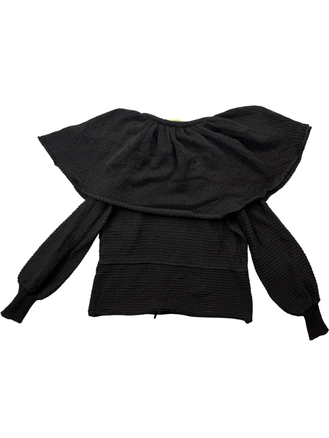 Black knitted cape by Mansfield Originals with a wide ruffled collar and long sleeves. Made from a blend of acrylic, mohair, and polyamide. Dry clean only.