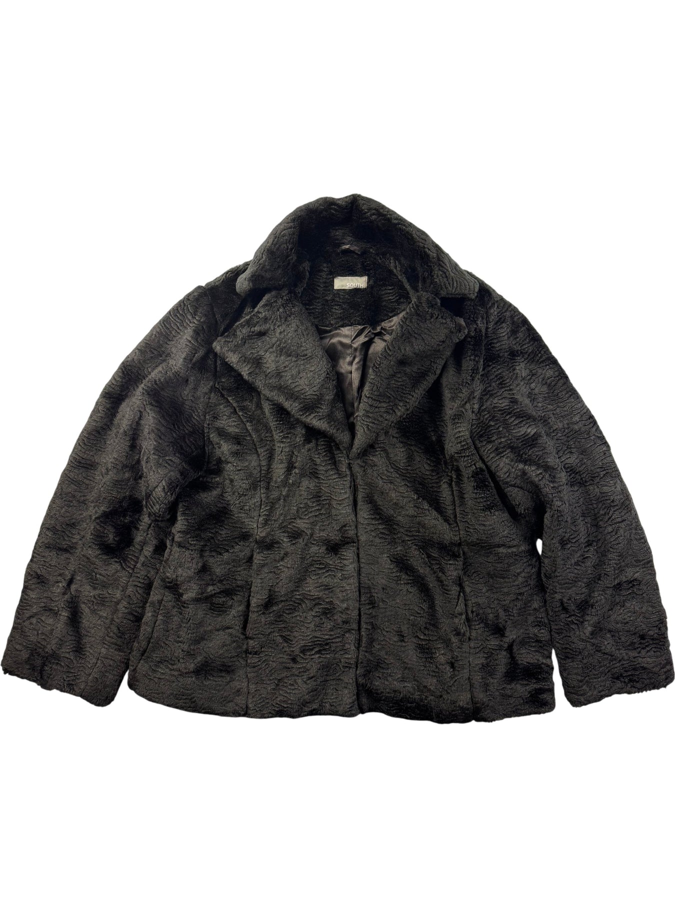 Black faux fur jacket with a classic collar and long sleeves. Made from a blend of 90% acrylic and 10% polyester for the shell, with a 100% polyester lining. Features a comfortable fit and an elegant style.