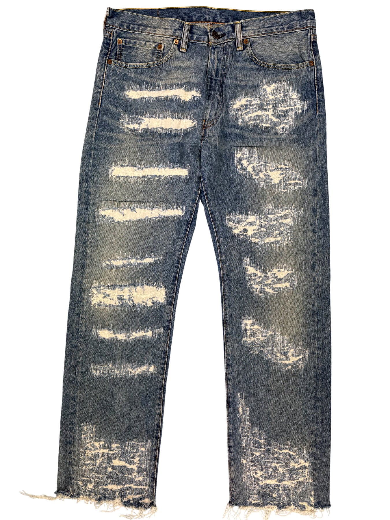 Levi Strauss 505 denim jeans with distressed detailing and raw hems. Features classic five-pocket design with branded leather patch on the back waistband.