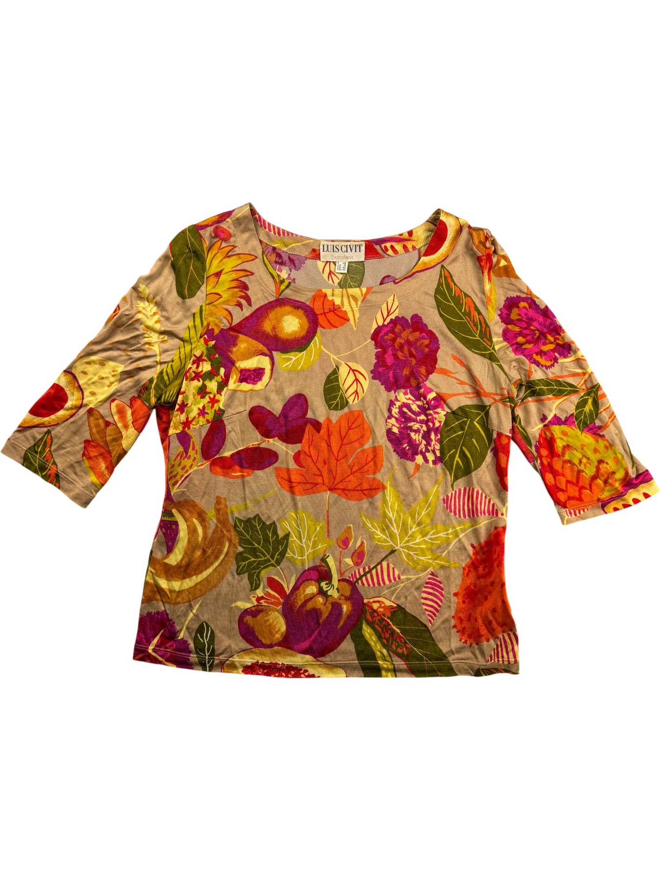 Features a vibrant floral pattern with multicolor leaves and fruits. Made in Spain with a soft and smooth fabric. The top has a round neckline and three-quarter sleeves.