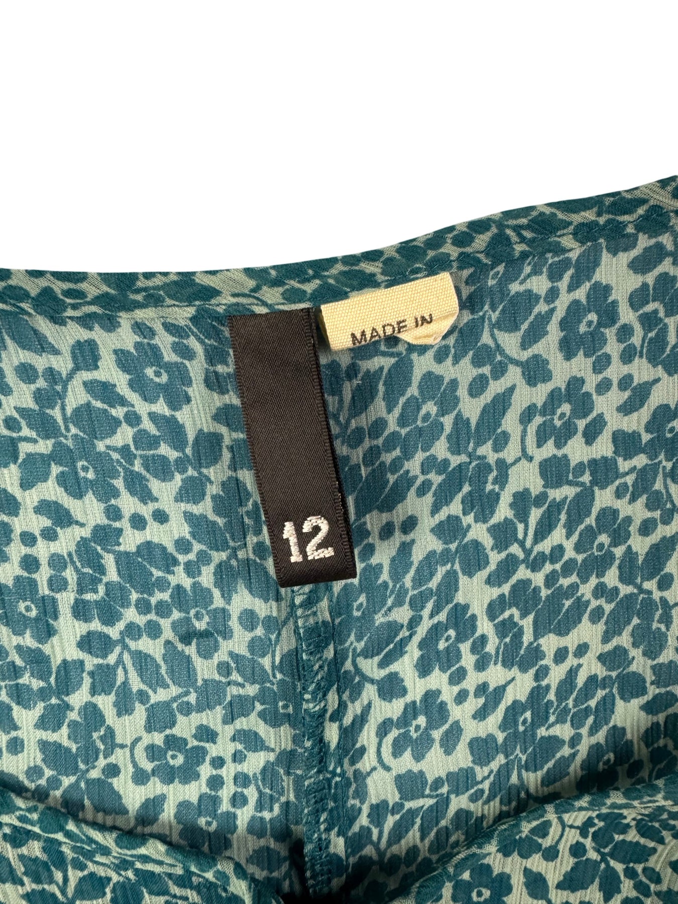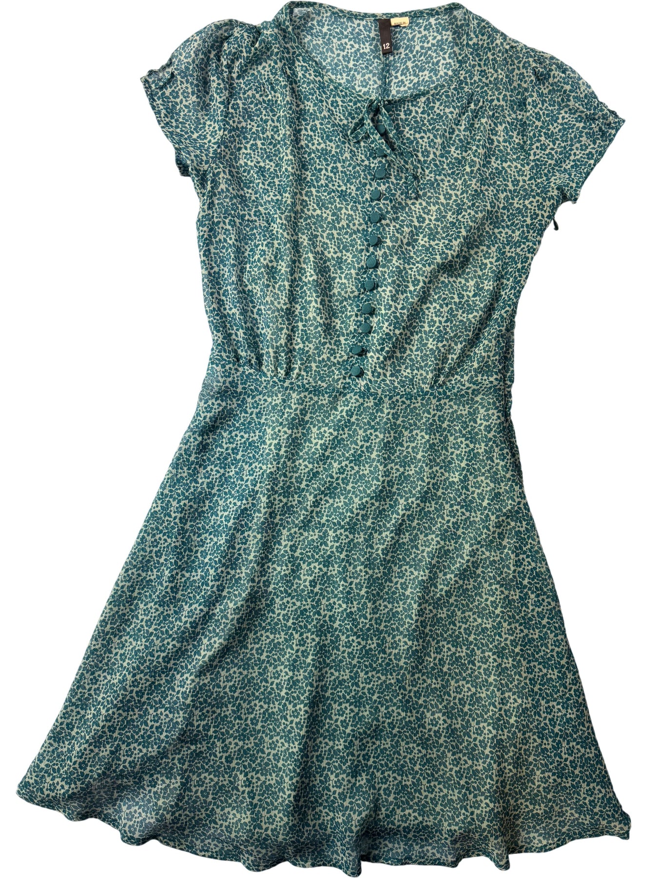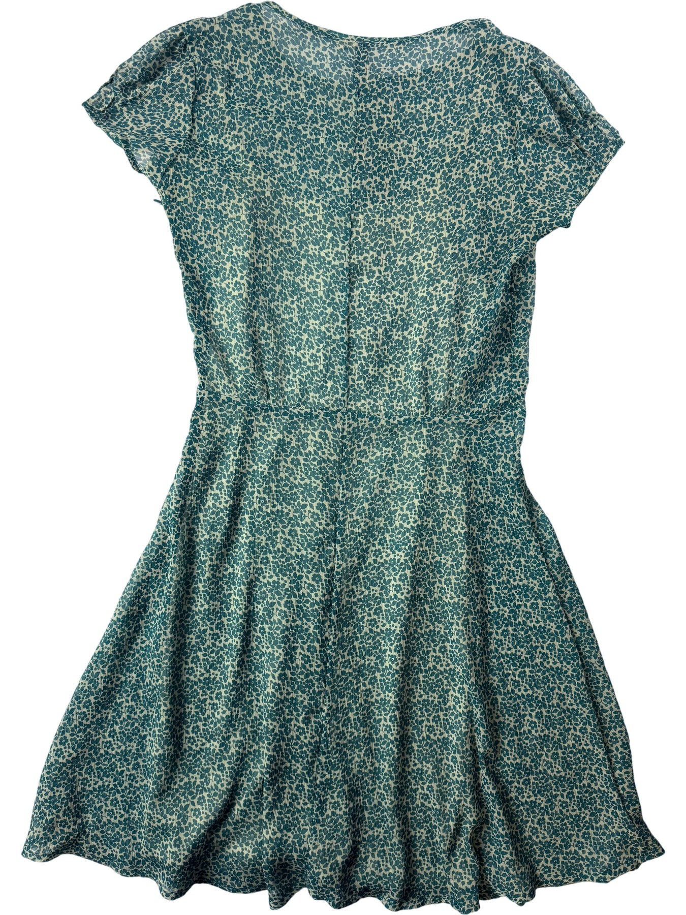 This dress features a charming floral print in a green and white colour scheme. It has a button-up front with fabric-covered buttons, a Peter Pan collar, and short sleeves. The dress is crafted from a lightweight fabric, perfect for casual wear.