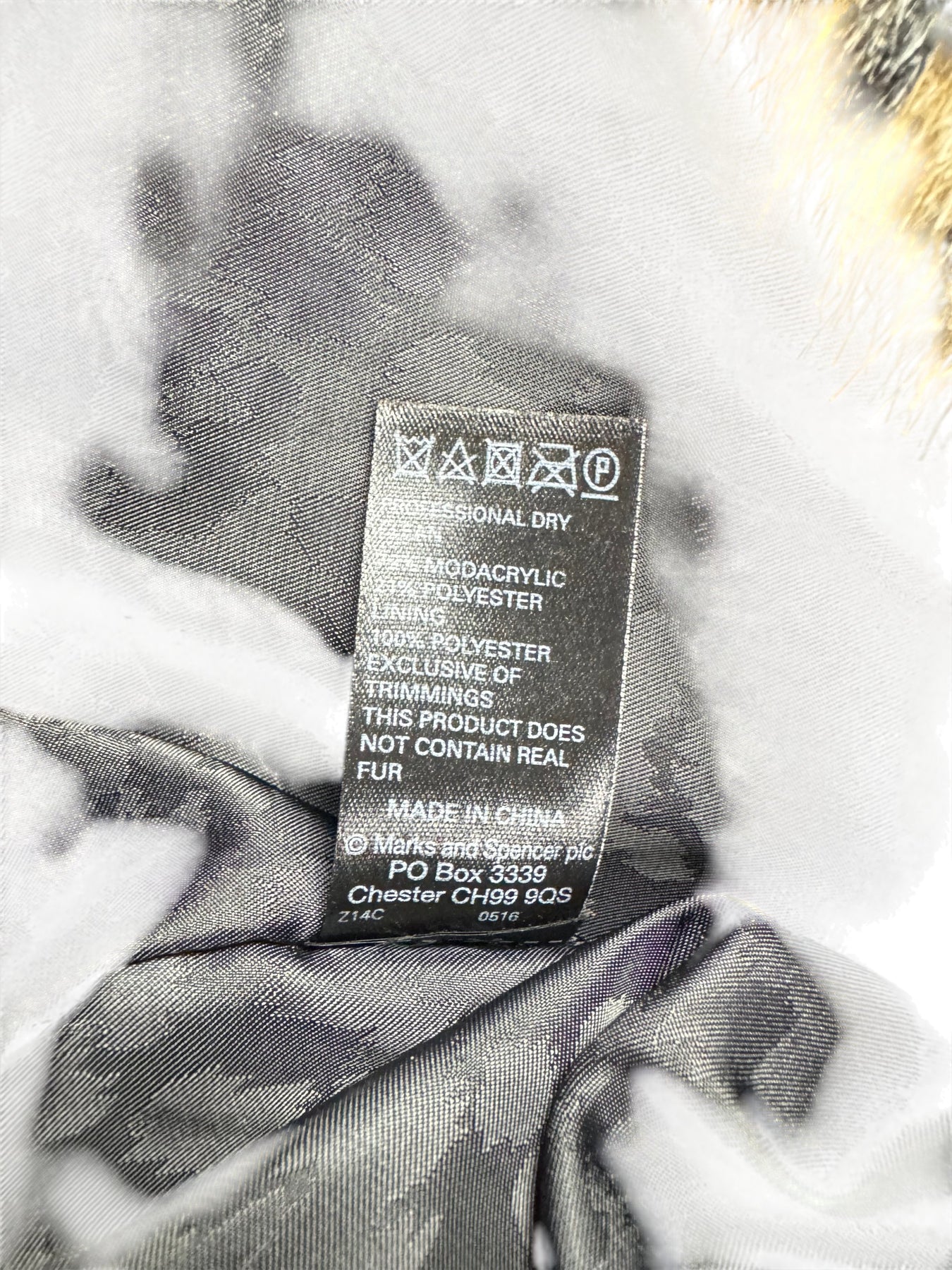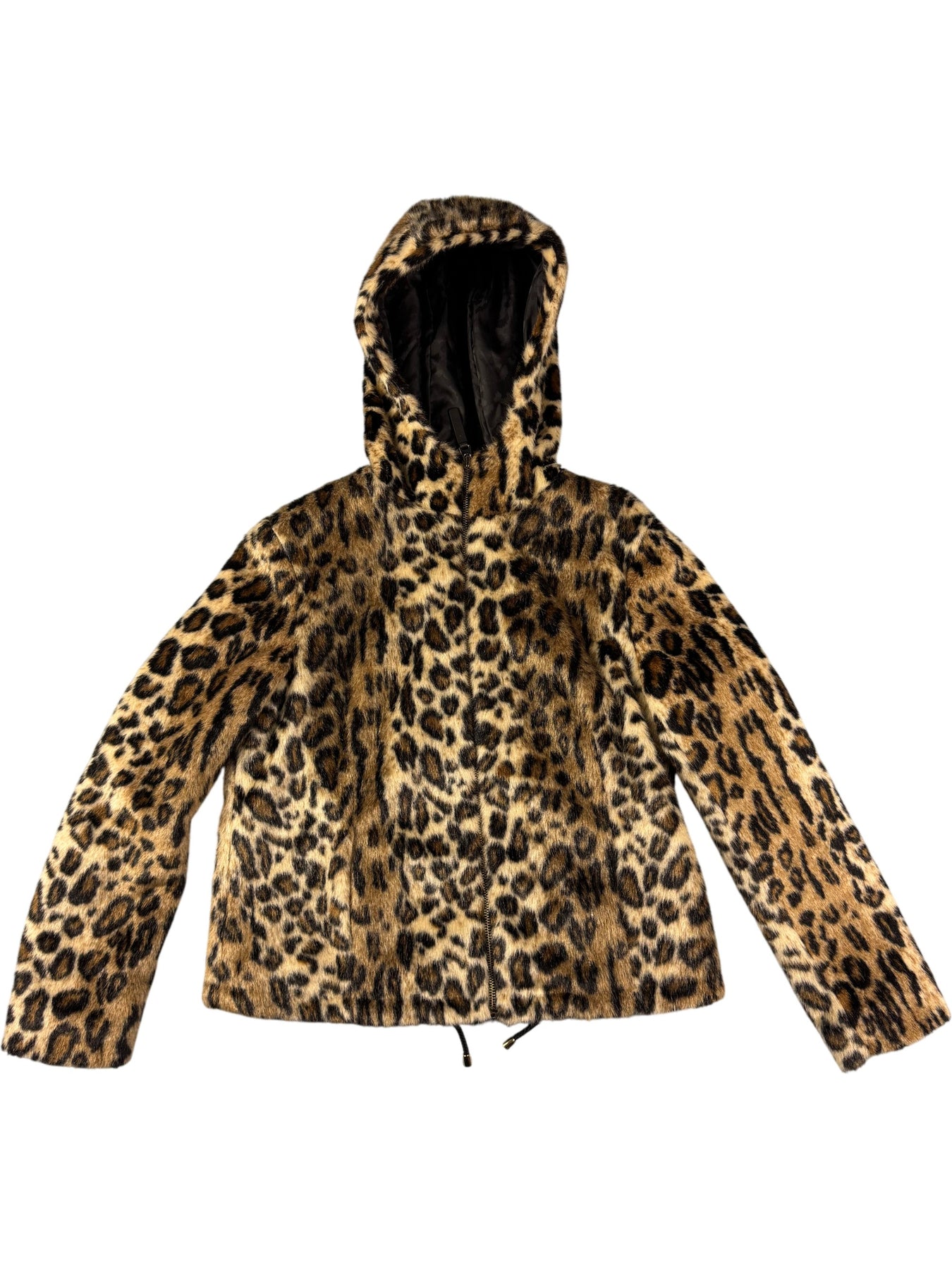 Leopard print hooded jacket made from modacrylic and polyester. Features a full zip closure and drawstring hem. Faux fur with no real fur content.
