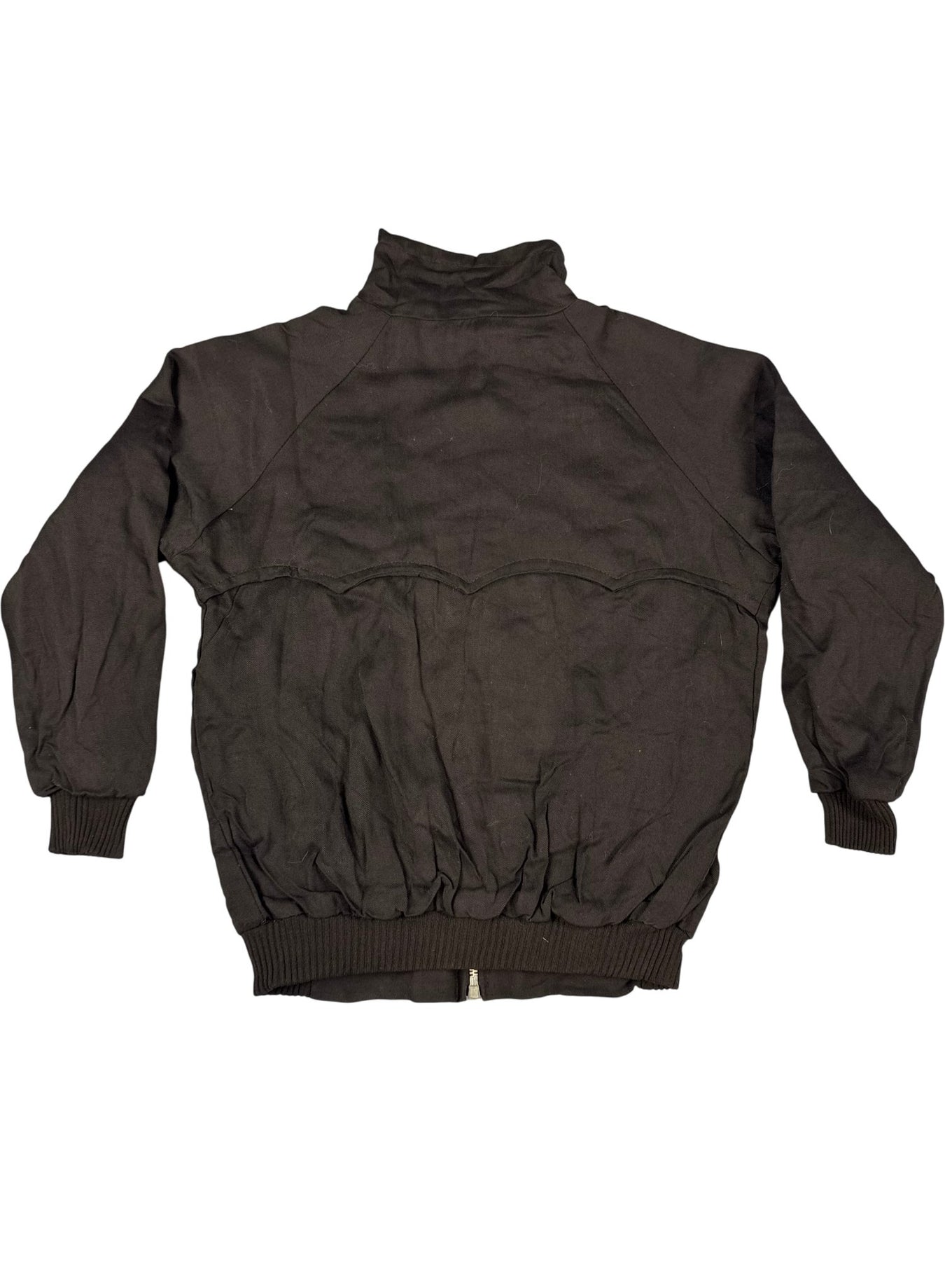 Black sport jacket with a zip closure and ribbed cuffs. Features two front buttoned pockets and a vibrant check lining for added style. High collar design.