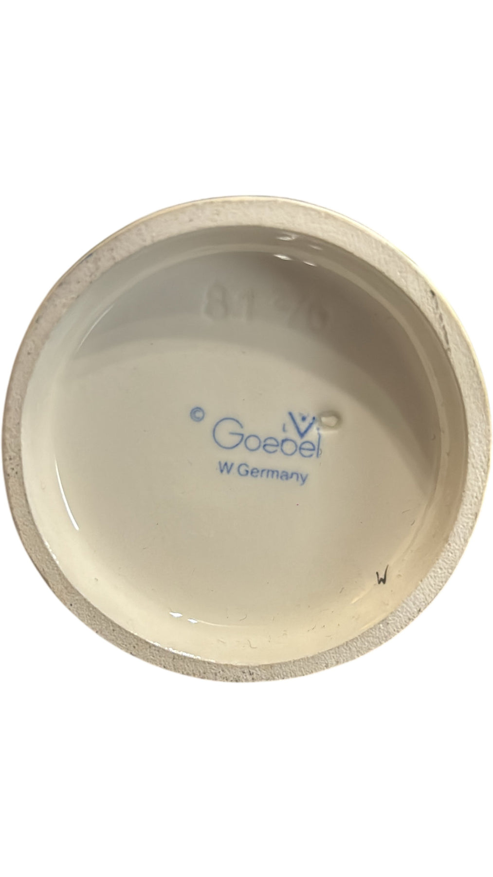 Goebel figurine made in W Germany, titled 'School Girl'. Features a young girl with a basket and backpack, dressed in an orange dress. Hand-painted ceramic material.
