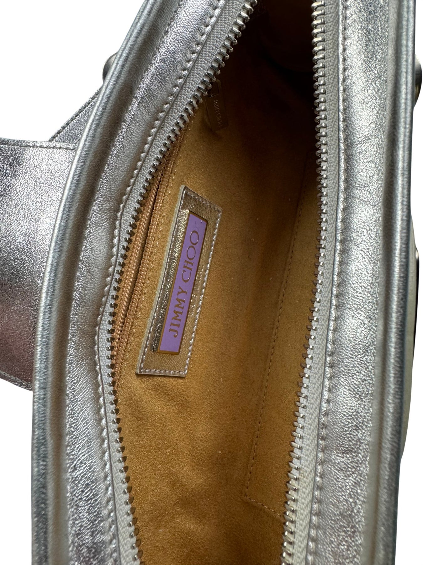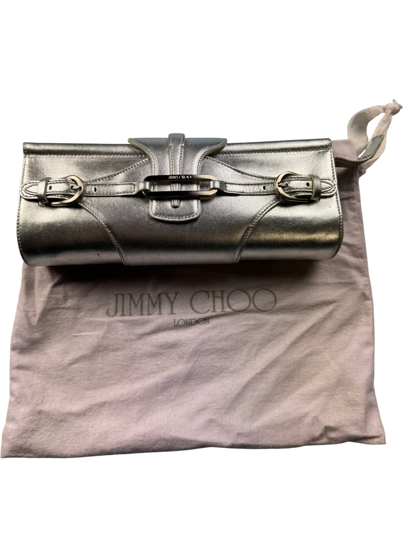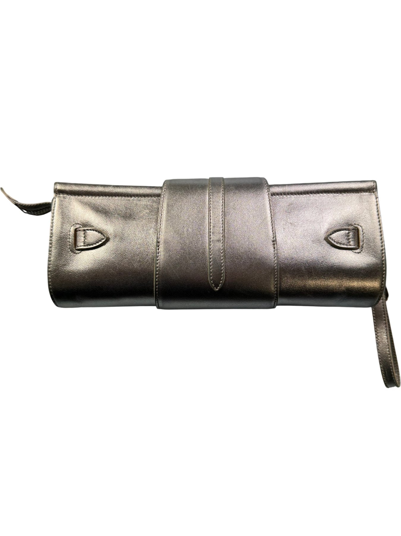 Metallic leather clutch with buckle detailing and zip closure. Features a detachable wrist strap and internal pocket.