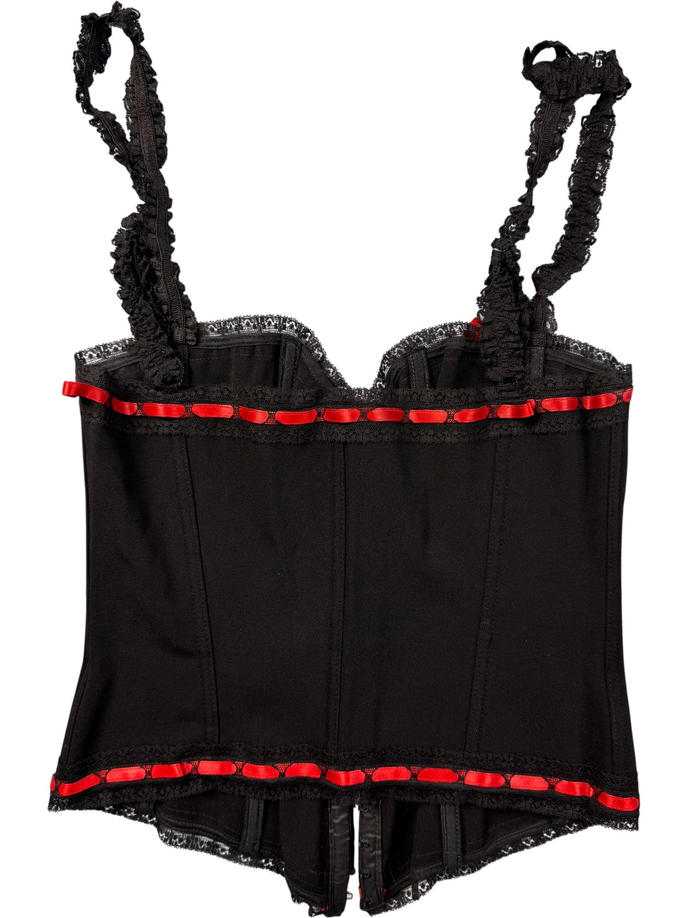 Moschino corset top featuring adjustable straps and lace detailing. Accented with red trim and hook-and-eye closures for a secure fit. Made in Italy.
