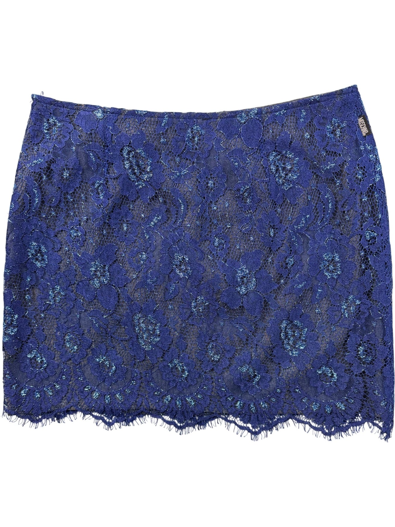 Blue lace skirt by Moschino made from a blend of viscose, nylon, and metal. Features floral lace overlay and zip closure.