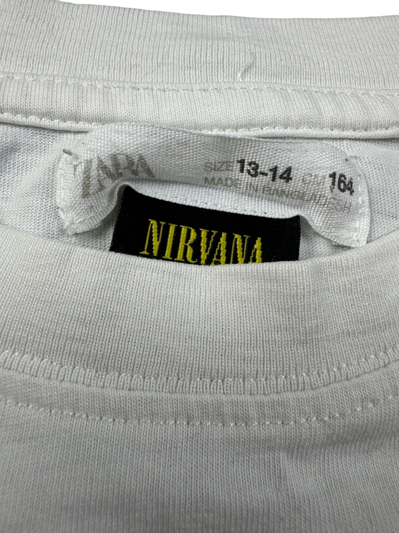 White T-shirt featuring a colorful Nirvana smiley face graphic on the front. The back displays the word 'Nevermind' in bold, repeated three times. Made from soft cotton fabric for comfort.
