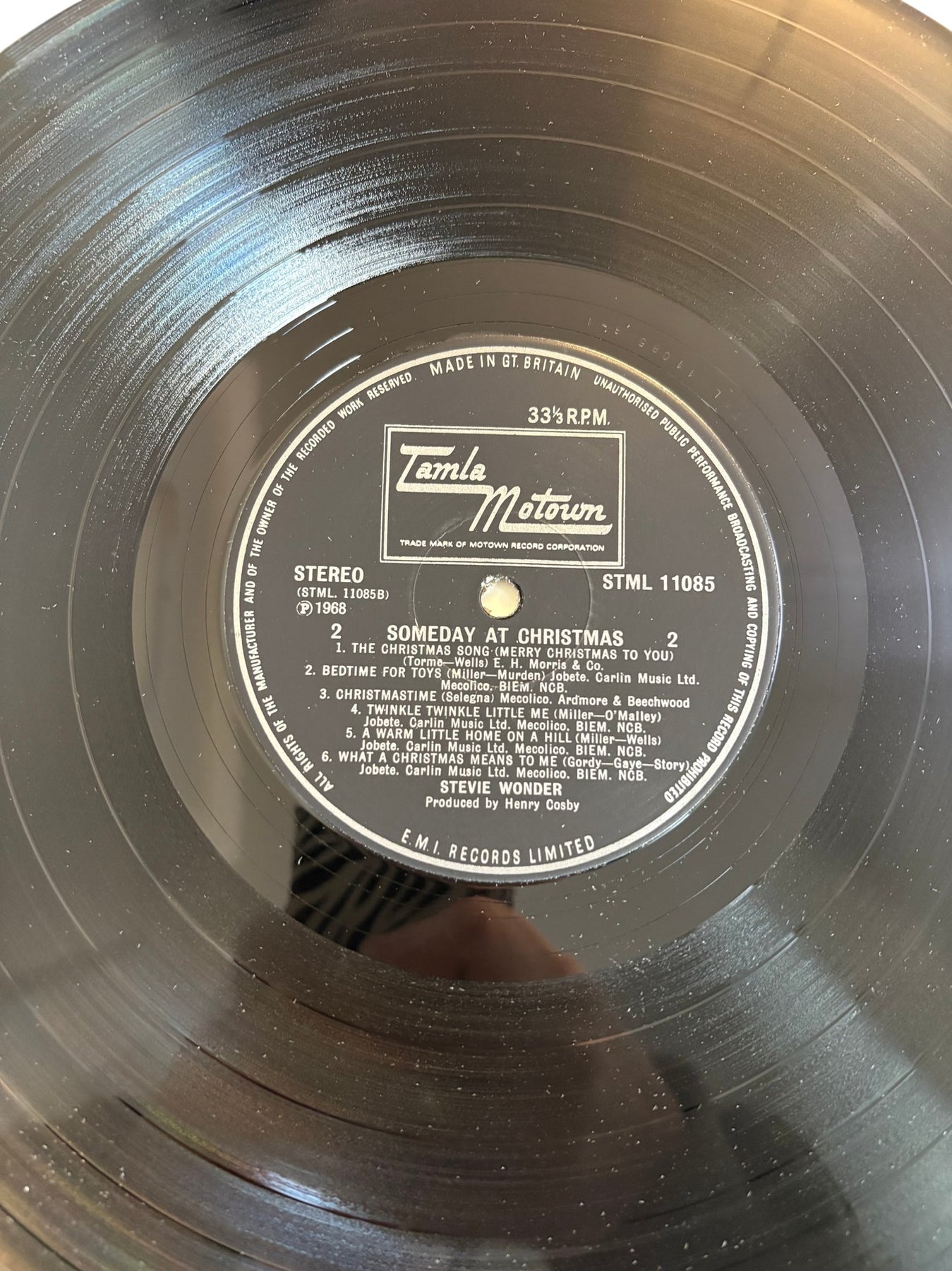 This is a Stevie Wonder vinyl record titled 'Someday at Christmas.' Released under the Tamla Motown label, it contains classic Christmas songs. Produced by Henry Cosby and made in Great Britain.