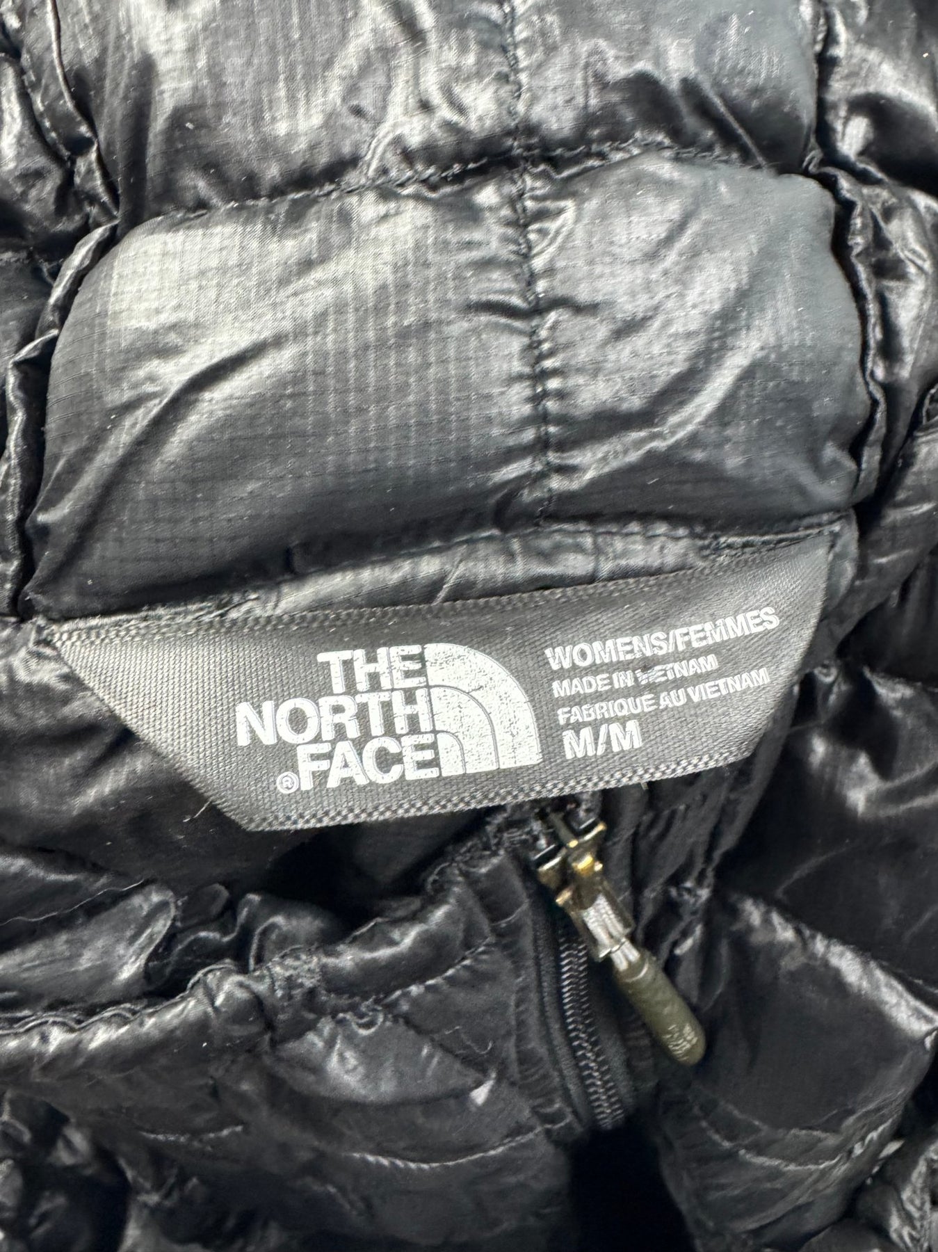 The North Face puffer jacket features a durable, quilted design with a hood for added warmth. It includes two zippered front pockets and a full zip closure. Made of lightweight material, perfect for insulation.