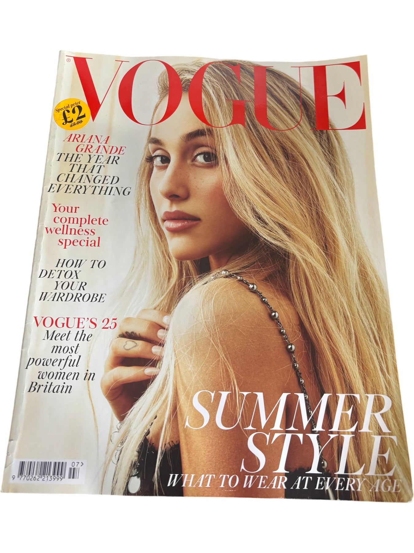 Featuring Ariana Grande on the cover, this issue of Vogue includes a wellness special and fashion insights. It offers a look into summer style and significant events that changed the year.